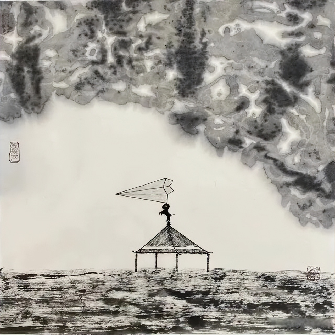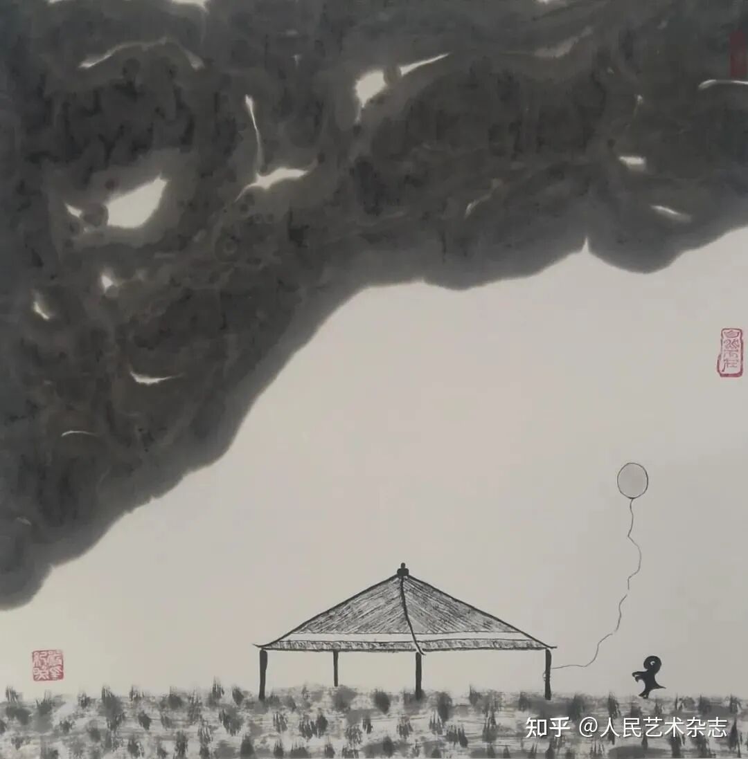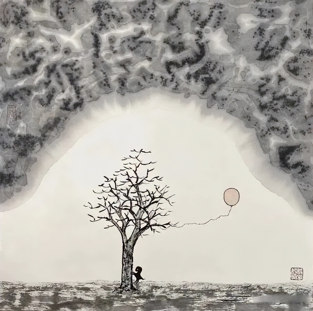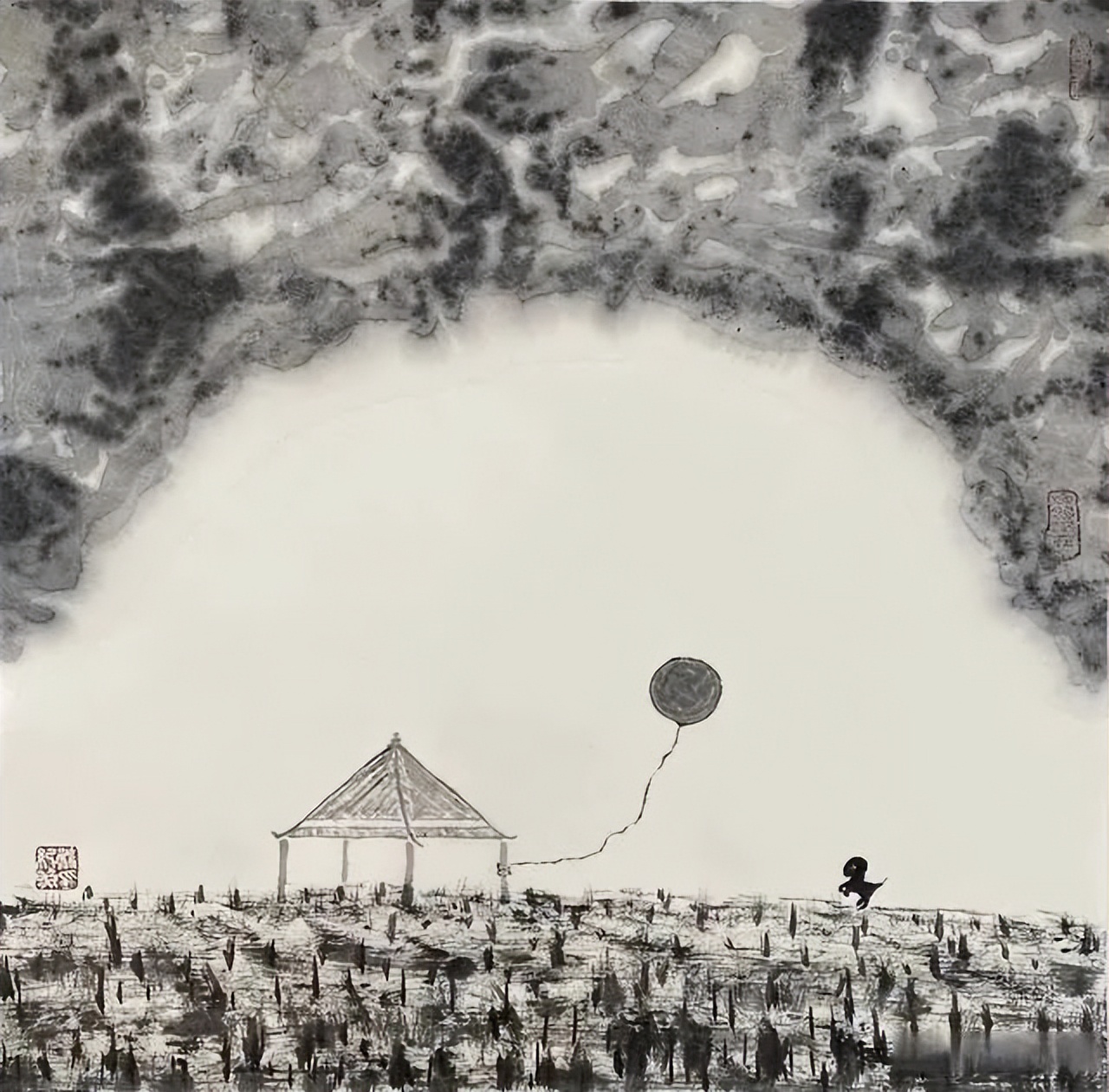 這種矛盾張力貫穿其創(chuàng)作脈絡(luò)。《亭與紅氣球》中,墨色云團厚重壓抑,人牽著紅氣球向亭奔跑,紅氣球在墨色中格外醒目,象征著在壓抑環(huán)境中對光明的追尋,而亭臺的靜謐與奔跑的動態(tài)、墨色的壓抑與紅色的明亮,形成又一組矛盾,直指人心在困境中堅守希望的執(zhí)著。