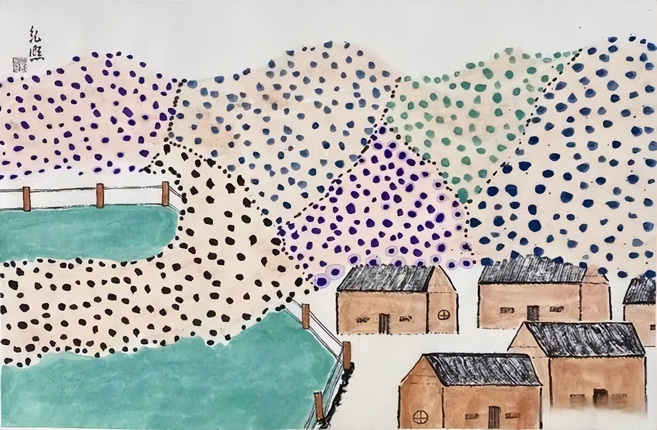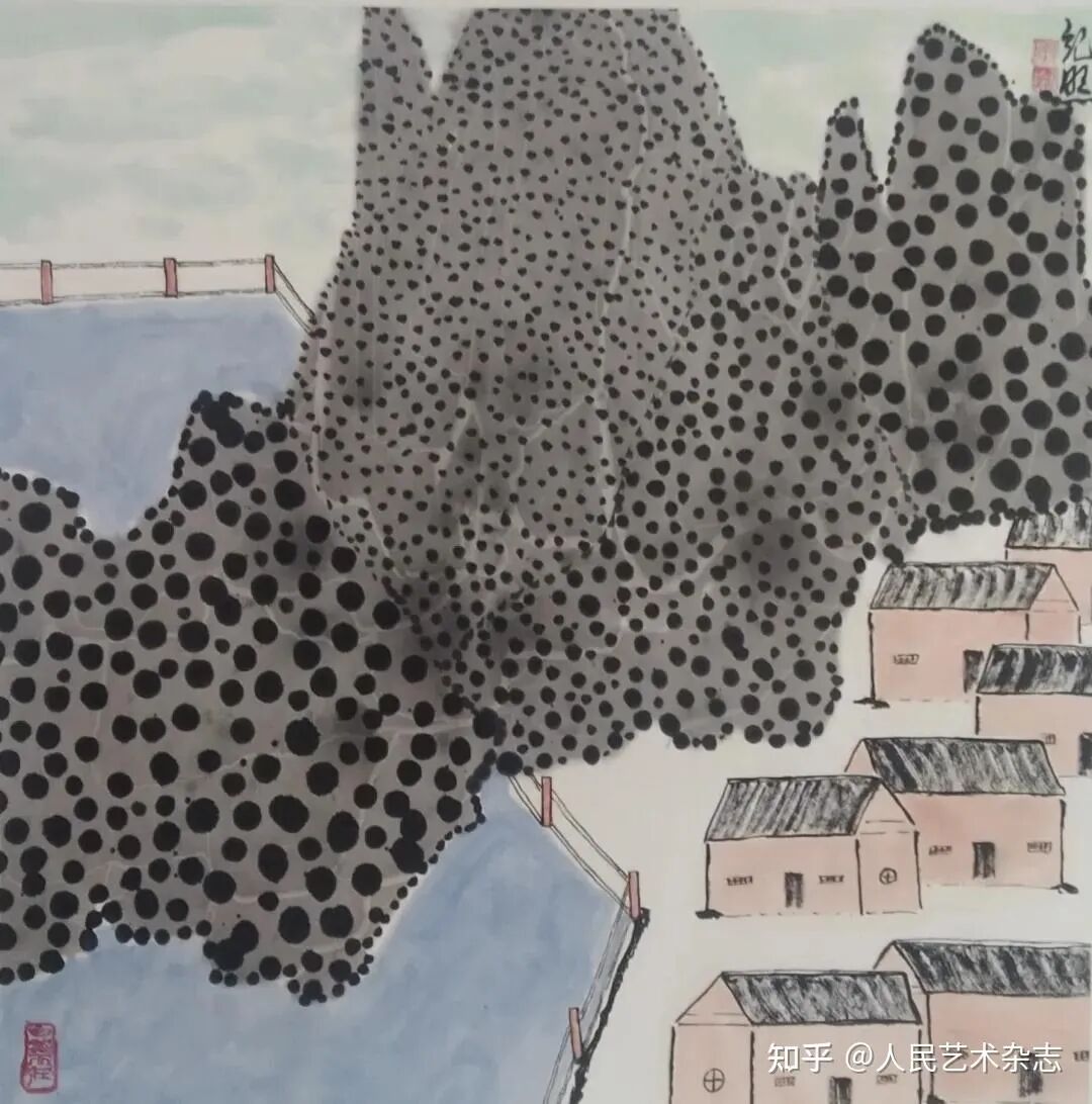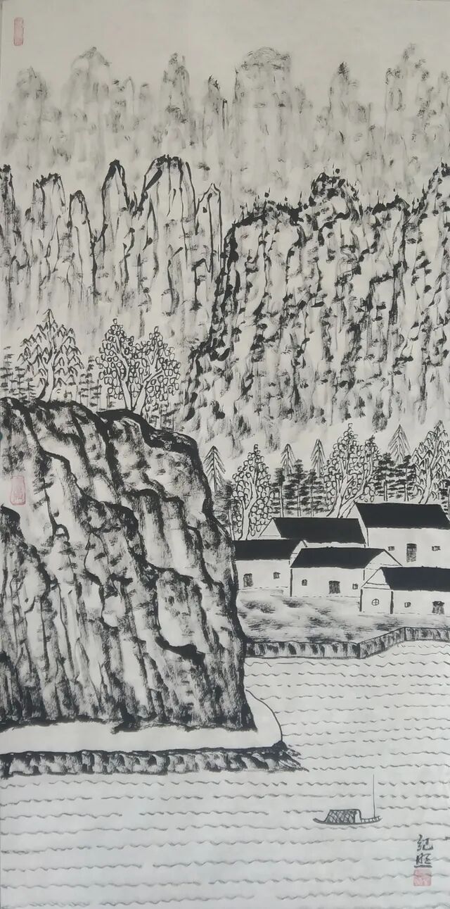 嚴紀照繪畫的核心母題,是“天地之間有物象,物象之中見人心”的空間敘事。無論是焦墨山水中臨江兀立的巨石、依水而建的村居,還是圓點彩墨間錯落排布的民居、澄澈水岸的枯樹,亦或“意畫詩境”系列里孤懸的亭臺、獨立的枯樹,每一個物象都并非自然景觀的復(fù)刻,而是人心的鏡像與精神的棲居之地。