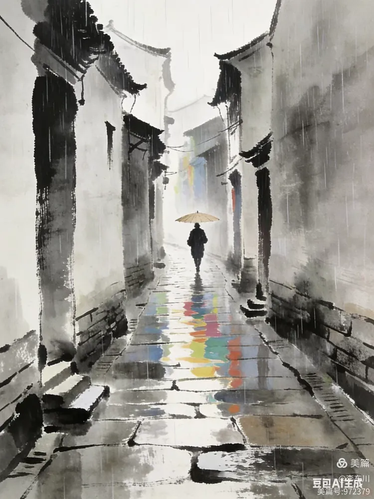 撐著油紙傘,獨(dú)自/彷徨在悠長(zhǎng),悠長(zhǎng)/又寂寥的雨巷,/我希望逢著/一個(gè)丁香一樣地/結(jié)著愁怨的姑娘……