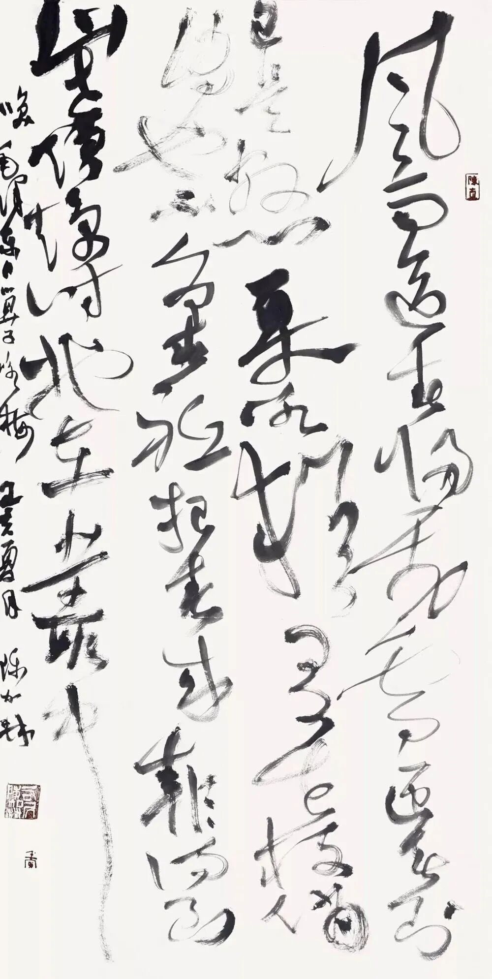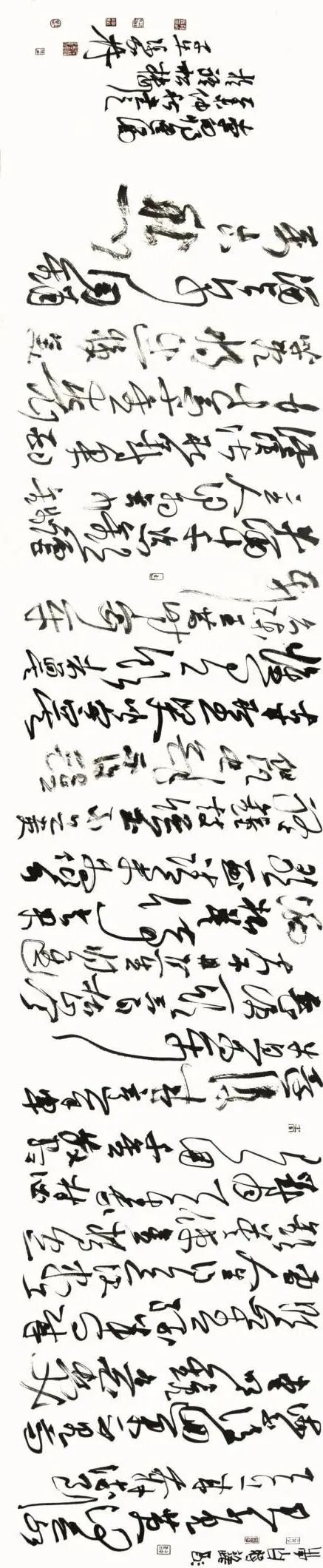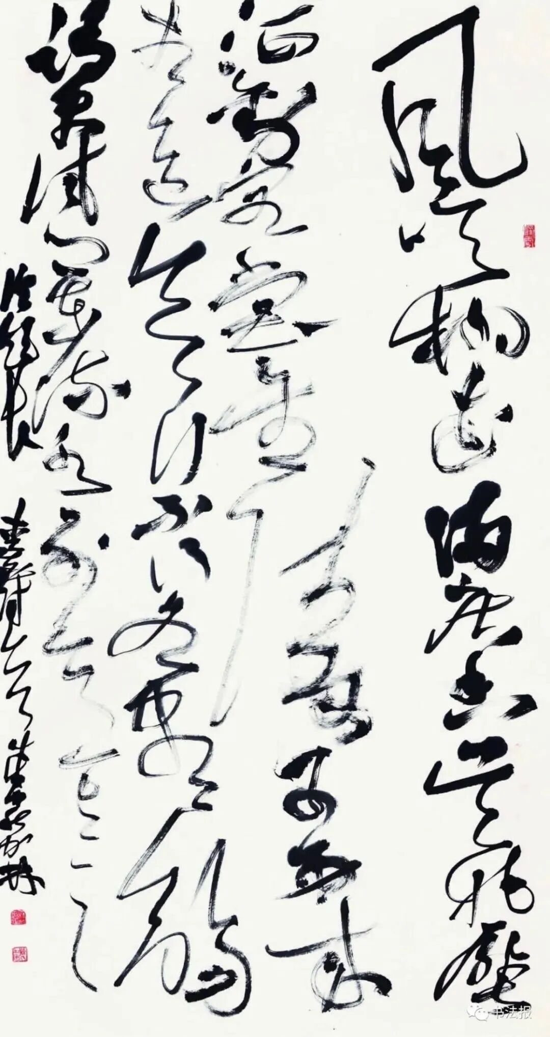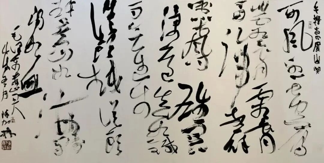 強調(diào)大小長短參差歷落,起伏變化,在整幅中視需要,作適當(dāng)?shù)目鋸堊冃?,使之開合有度,氣趣并進(jìn)。墨法講究濃淡渴漲的豐富。如有的漲筆使字形擴張,而有的渴筆飛白則已是筆不蓄墨,但卻一任書寫,以余愚見這都?xì)庵?,筆到意隨的結(jié)果。章法則取信札意味,給人以縱橫奔駟、自然天成的藝術(shù)效果。總之,加林對筆墨的駕馭是隨機生發(fā),以氣勢撼人,如長虹映天,似珠落玉盤。