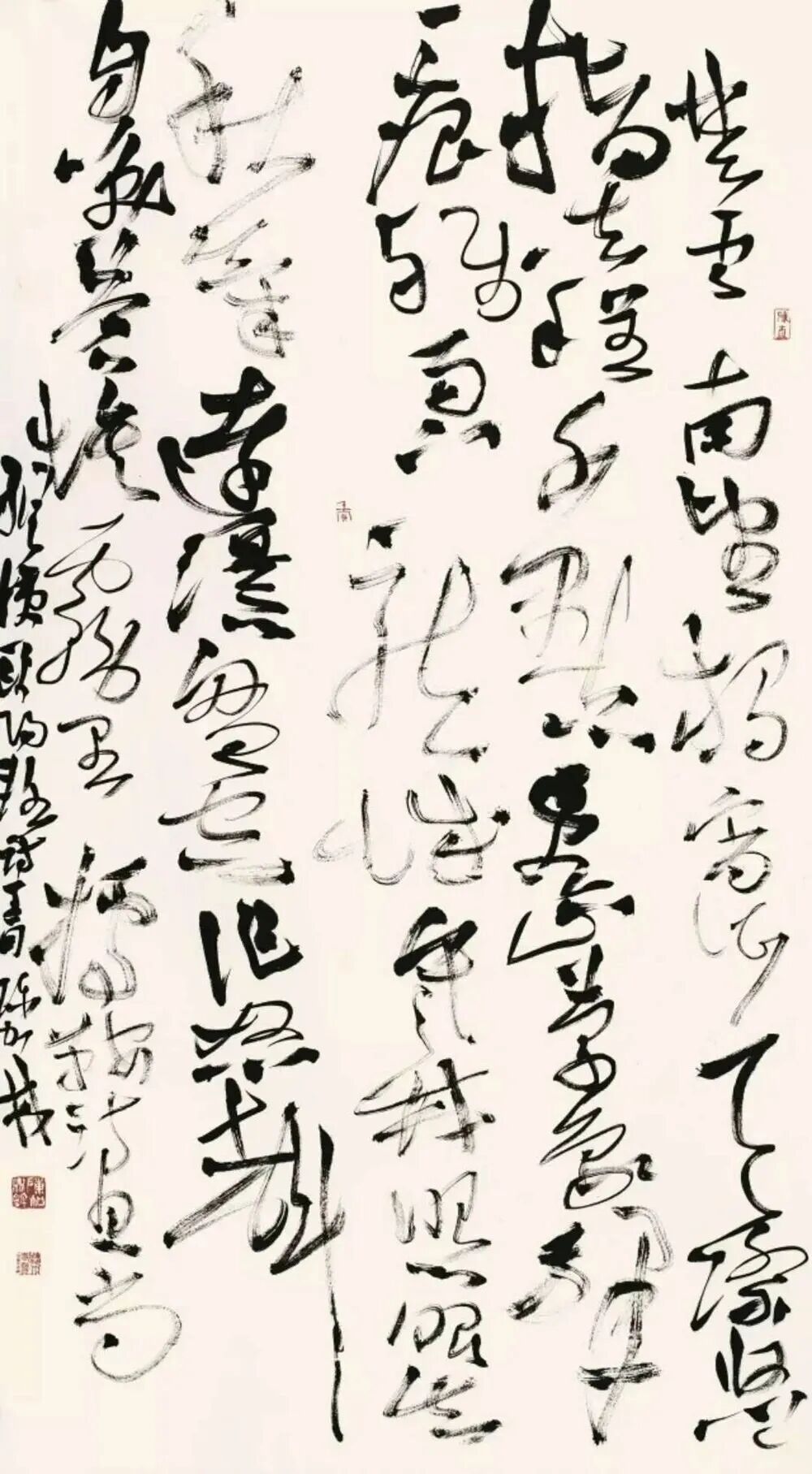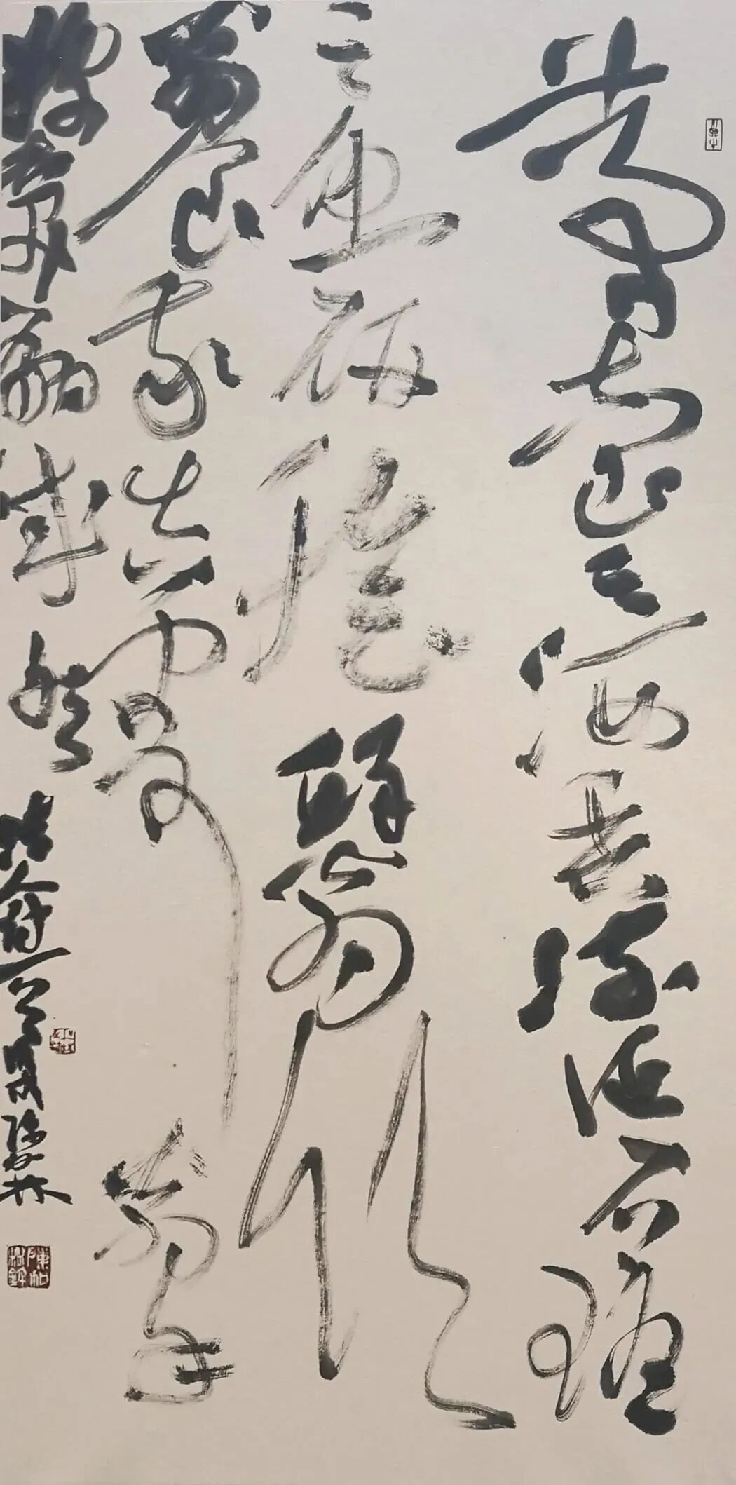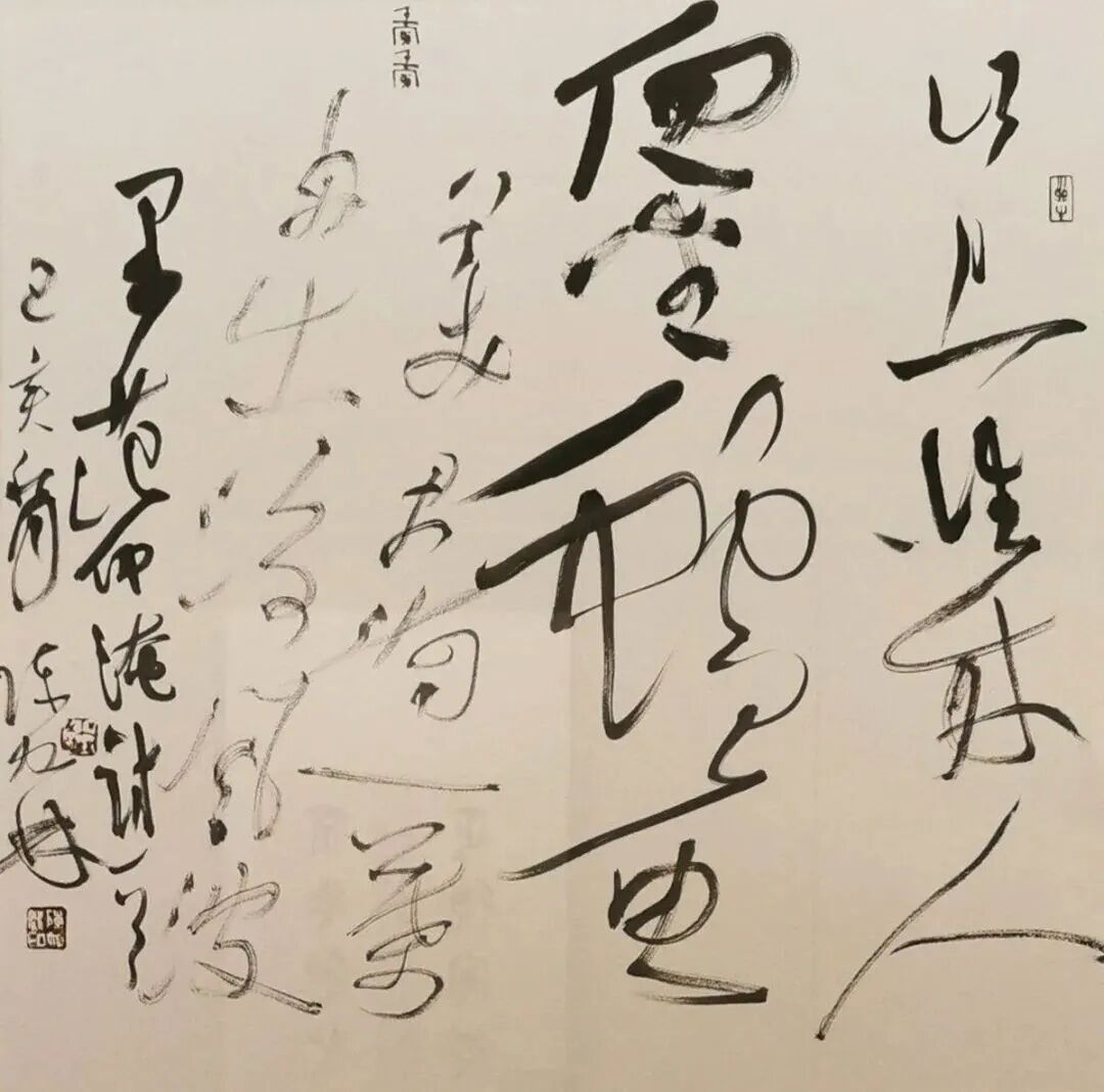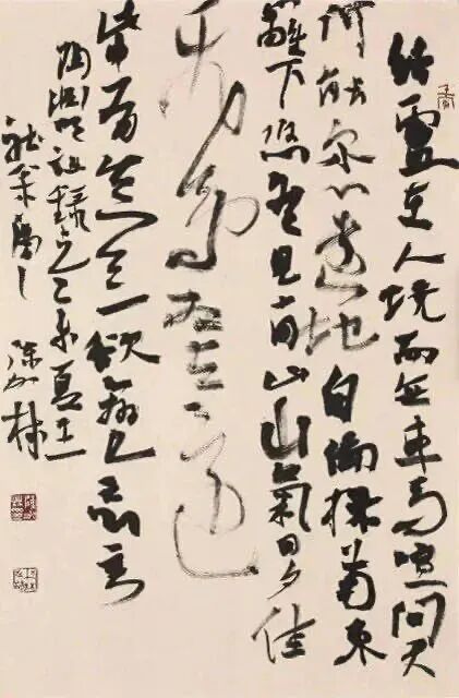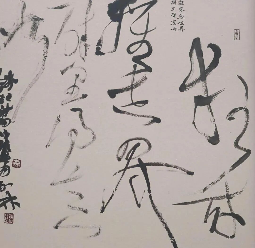 強調(diào)大小長短參差歷落,起伏變化,在整幅中視需要,作適當(dāng)?shù)目鋸堊冃?,使之開合有度,氣趣并進(jìn)。墨法講究濃淡渴漲的豐富。如有的漲筆使字形擴張,而有的渴筆飛白則已是筆不蓄墨,但卻一任書寫,以余愚見這都?xì)庵?,筆到意隨的結(jié)果。章法則取信札意味,給人以縱橫奔駟、自然天成的藝術(shù)效果。總之,加林對筆墨的駕馭是隨機生發(fā),以氣勢撼人,如長虹映天,似珠落玉盤。