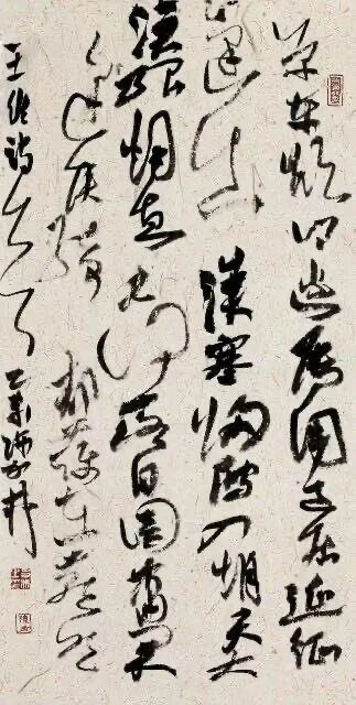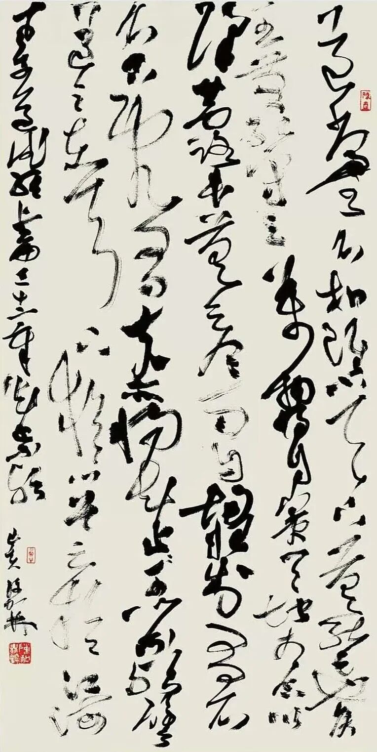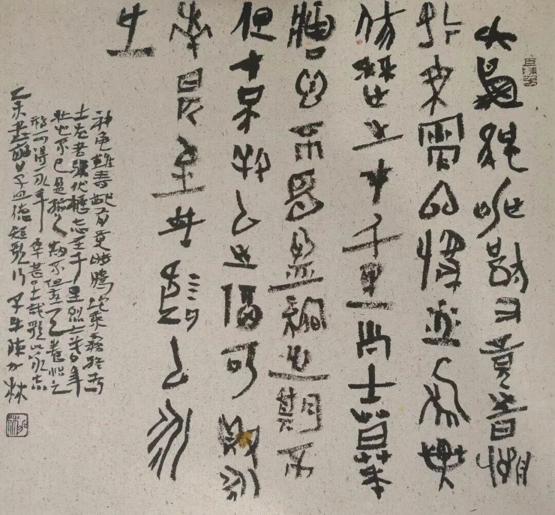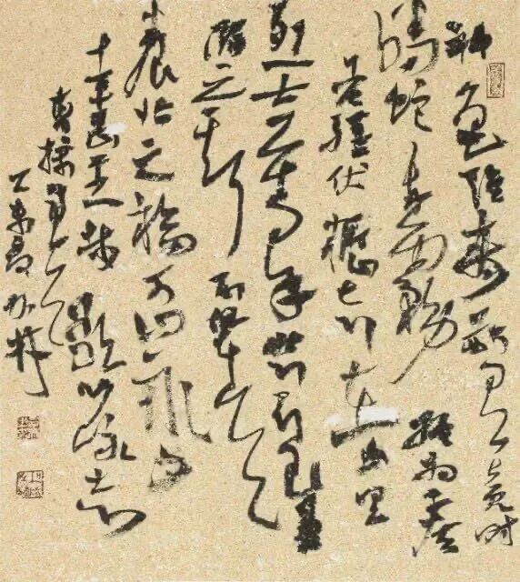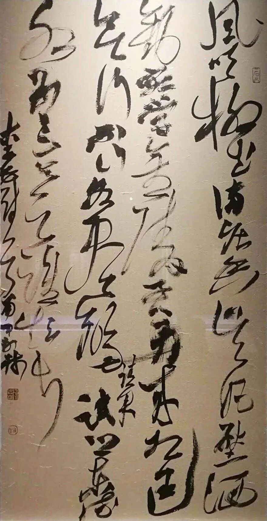 強調(diào)大小長短參差歷落,起伏變化,在整幅中視需要,作適當(dāng)?shù)目鋸堊冃?,使之開合有度,氣趣并進(jìn)。墨法講究濃淡渴漲的豐富。如有的漲筆使字形擴張,而有的渴筆飛白則已是筆不蓄墨,但卻一任書寫,以余愚見這都?xì)庵?,筆到意隨的結(jié)果。章法則取信札意味,給人以縱橫奔駟、自然天成的藝術(shù)效果。總之,加林對筆墨的駕馭是隨機生發(fā),以氣勢撼人,如長虹映天,似珠落玉盤。