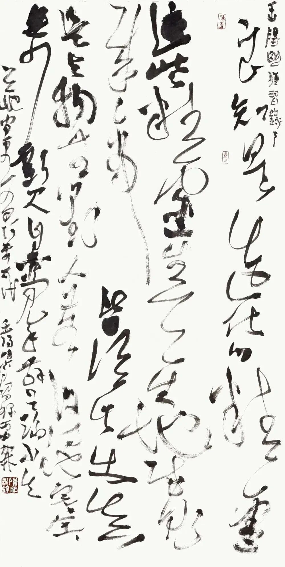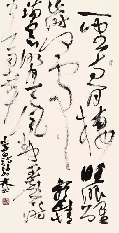 有的只是大膽落筆,筆筆生發(fā),隨勢而為,因之用筆靈活而多變,不經(jīng)意間將書法的線條美與金石氣融入畫中,因有扎實的書法功底為繪畫線條作支撐,線質(zhì)的力量與倚側(cè)變幻、沉厚生辣自是與人不同。線條是加林繪畫的靈魂,他筆下的線條有的似金文隸書的質(zhì)樸凝重,有的如行草書的飄逸瀟灑,給人以動靜相生、剛?cè)嵯酀母杏X。