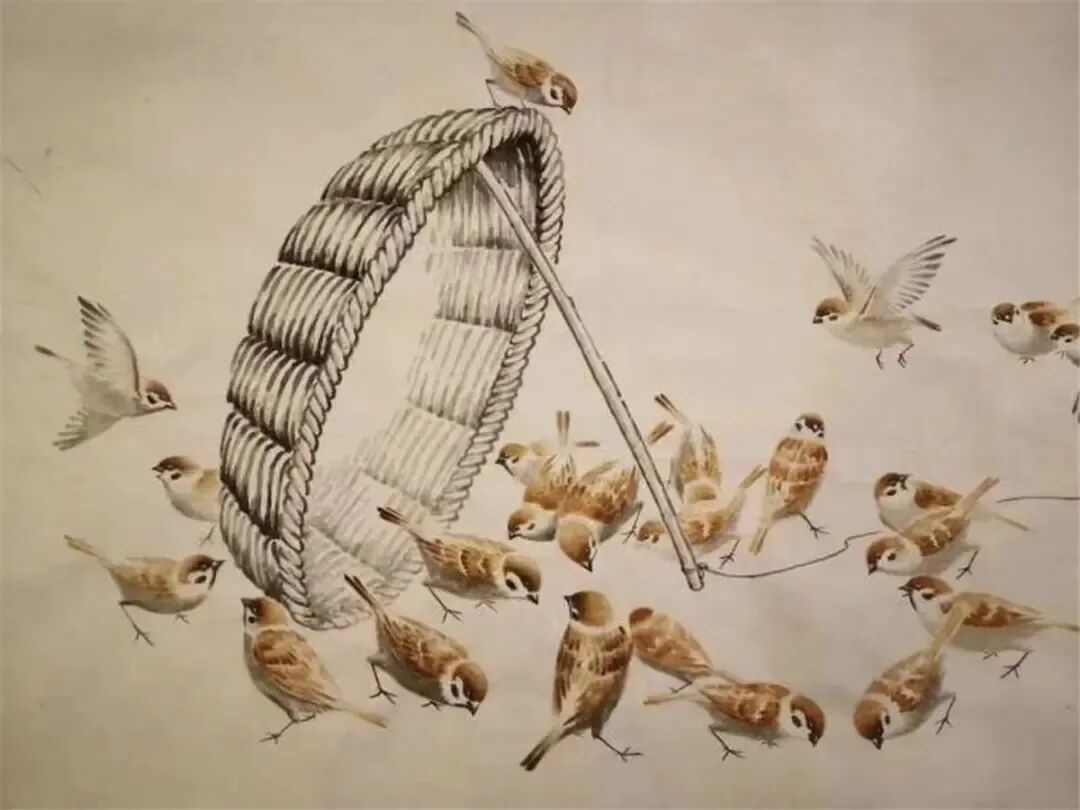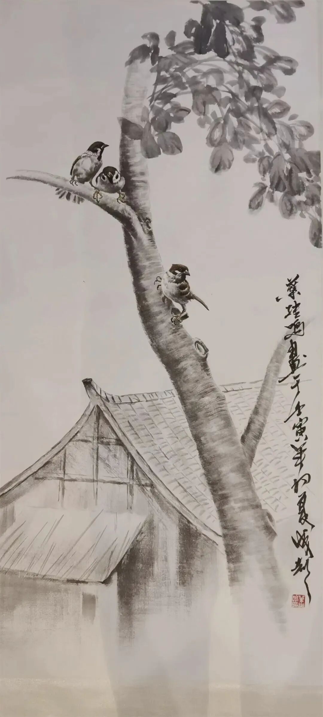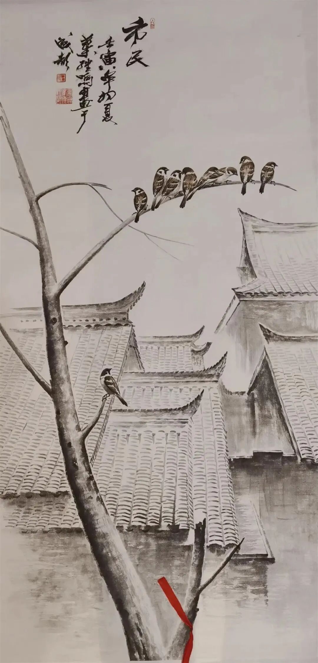 細(xì)觀葉繼鳴先生作品,尤以靈雀之姿與猛虎之魂最撼人心魄。他筆下的麻雀,絕非畫(huà)譜中的僵化符號(hào)。墨色濃淡相宜,點(diǎn)染靈動(dòng)飄逸,成群結(jié)隊(duì),歡躍喧騰于枝頭檐下,構(gòu)成一幅幅流動(dòng)的生命交響。畫(huà)家俯察萬(wàn)物之精微,于纖毫羽翼間捕捉其活潑天性與盎然生機(jī),將平凡小雀點(diǎn)化為充滿(mǎn)詩(shī)意與溫度的生命詠嘆。其雀雖小,意趣萬(wàn)千,洋溢著對(duì)生活最質(zhì)樸深沉的熱愛(ài)。