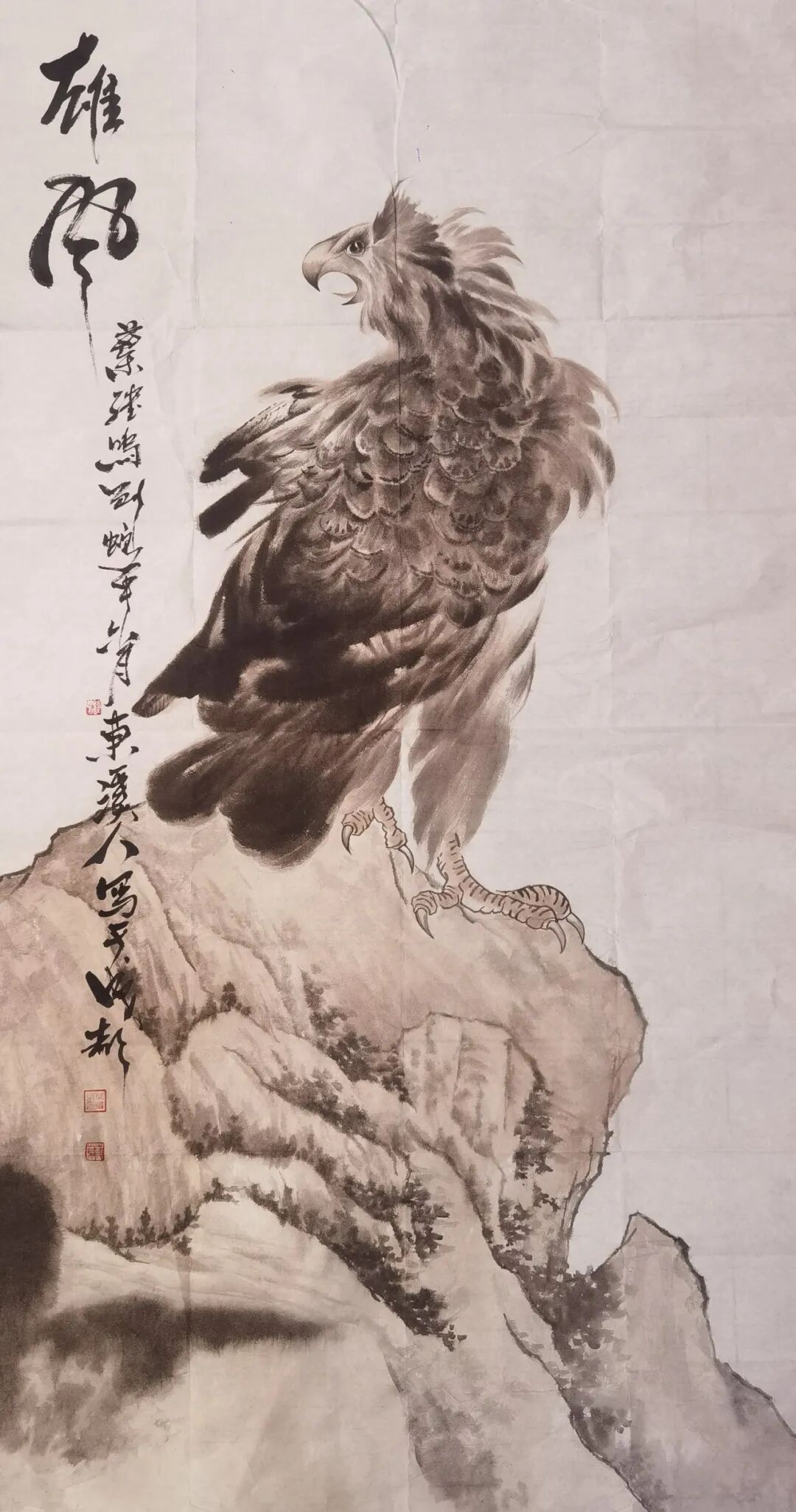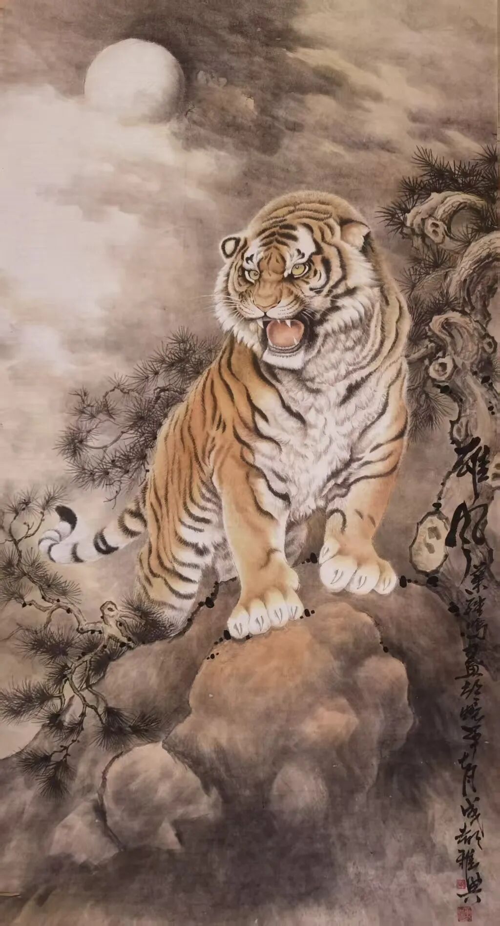而當(dāng)他揮毫描繪猛虎,則盡顯雄渾磅礴的大家氣象。先生深諳“虎威在骨”之理,以蒼勁雄健的線條勾勒虎之形骸,以濃重酣暢的墨色渲染其威猛氣勢(shì)。畫(huà)中猛虎自山巔俯沖而下,筋骨強(qiáng)健如鐵鑄,通體墨色濃淡相生,筆觸如刀劈斧鑿,盡顯肌肉賁張之力道?;⑹装簱P(yáng),怒目灼灼似電,仿佛裂壑生風(fēng),未聞其嘯而威勢(shì)已迫人眉睫。完美詮釋了“虎嘯風(fēng)生,龍騰云起”的東方氣魄,凜然正氣直貫蒼穹。