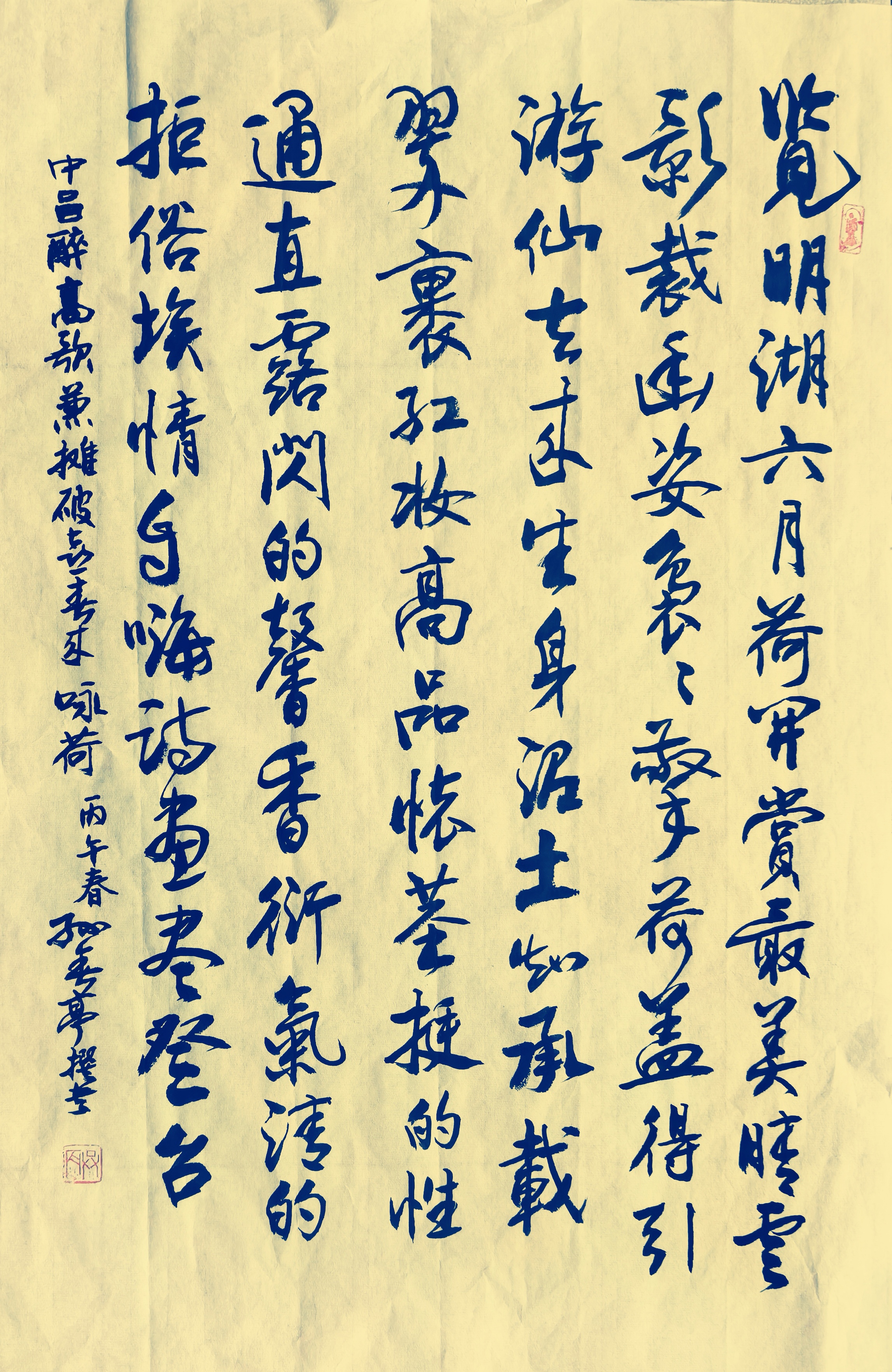 覽明湖六月荷開(kāi),賞最美晴云影裁。幽姿裊裊擎荷蓋,得引游仙去來(lái)。(兼)生身泥土知承載,翠裹紅妝高品懷。莖挺的性通直,露閃的馨香衍,氣清的拒俗埃。情自嗨,詩(shī)畫(huà)盡吟臺(tái)。