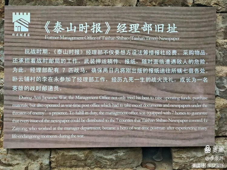 ? ? ? ?在老家“臥云鋪”村《泰山時(shí)報(bào)》舊址的墻上,我看到這樣一段記述:“抗戰(zhàn)時(shí)期《泰山時(shí)報(bào)》經(jīng)理部不僅想方設(shè)法籌措報(bào)社經(jīng)費(fèi),采購(gòu)物品,還承擔(dān)著戰(zhàn)時(shí)郵局的工作,武裝押運(yùn)稿件、報(bào)紙,隨時(shí)面臨遭遇敵人的危險(xiǎn),經(jīng)理部配有七匹戰(zhàn)馬,確保兩日內(nèi)將出版的報(bào)紙送往所轄七縣各處。臥云鋪的李在永參加了經(jīng)理部工作,經(jīng)歷九死一生的戰(zhàn)火洗禮,成長(zhǎng)為一名英雄的戰(zhàn)時(shí)郵遞員”。