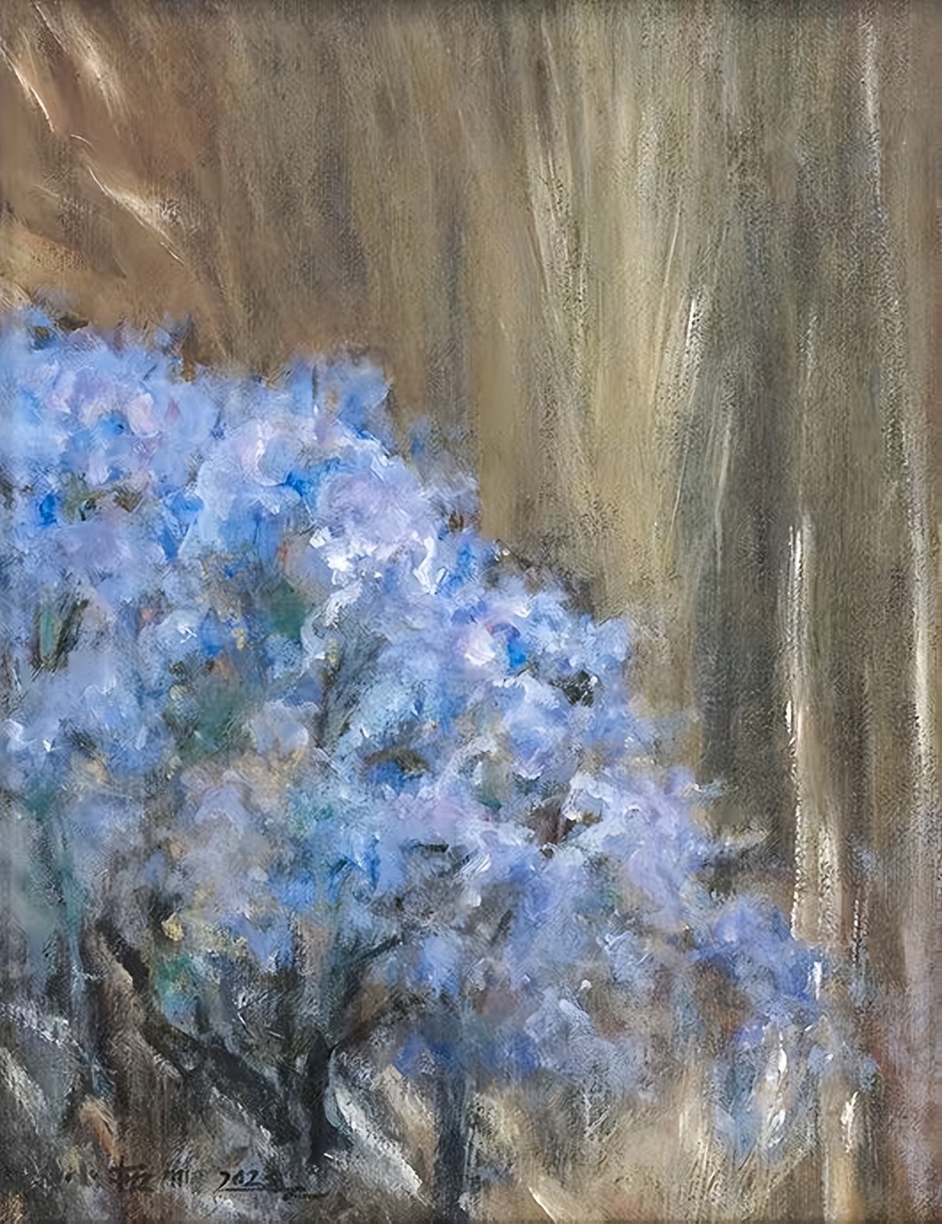 薛小敏參展的作品,是其平面油畫風格的經(jīng)典之作。畫面中,金黃的蘆葦叢以靈動的筆觸鋪陳,似風拂過般搖曳生姿,占據(jù)視覺核心;成群白鷺或棲于蘆間、或翔于碧空,潔白羽翼在藍調(diào)水天的映襯下空靈澄澈,與蘆葦?shù)呐S形成溫柔的色彩碰撞。她以平面化的視覺表達,弱化傳統(tǒng)油畫的空間縱深,卻強化了畫面的詩意氛圍與東方留白意境,將濕地生態(tài)的和諧之美、自然生靈的靈動之態(tài),在油彩的交融中娓娓道來。這幅作品不僅展現(xiàn)了中國當代油畫的創(chuàng)新活力,更以美好意象,呼應(yīng)中泰兩國共守自然、珍視生態(tài)的理念,成為跨越山海的文化共鳴載體。